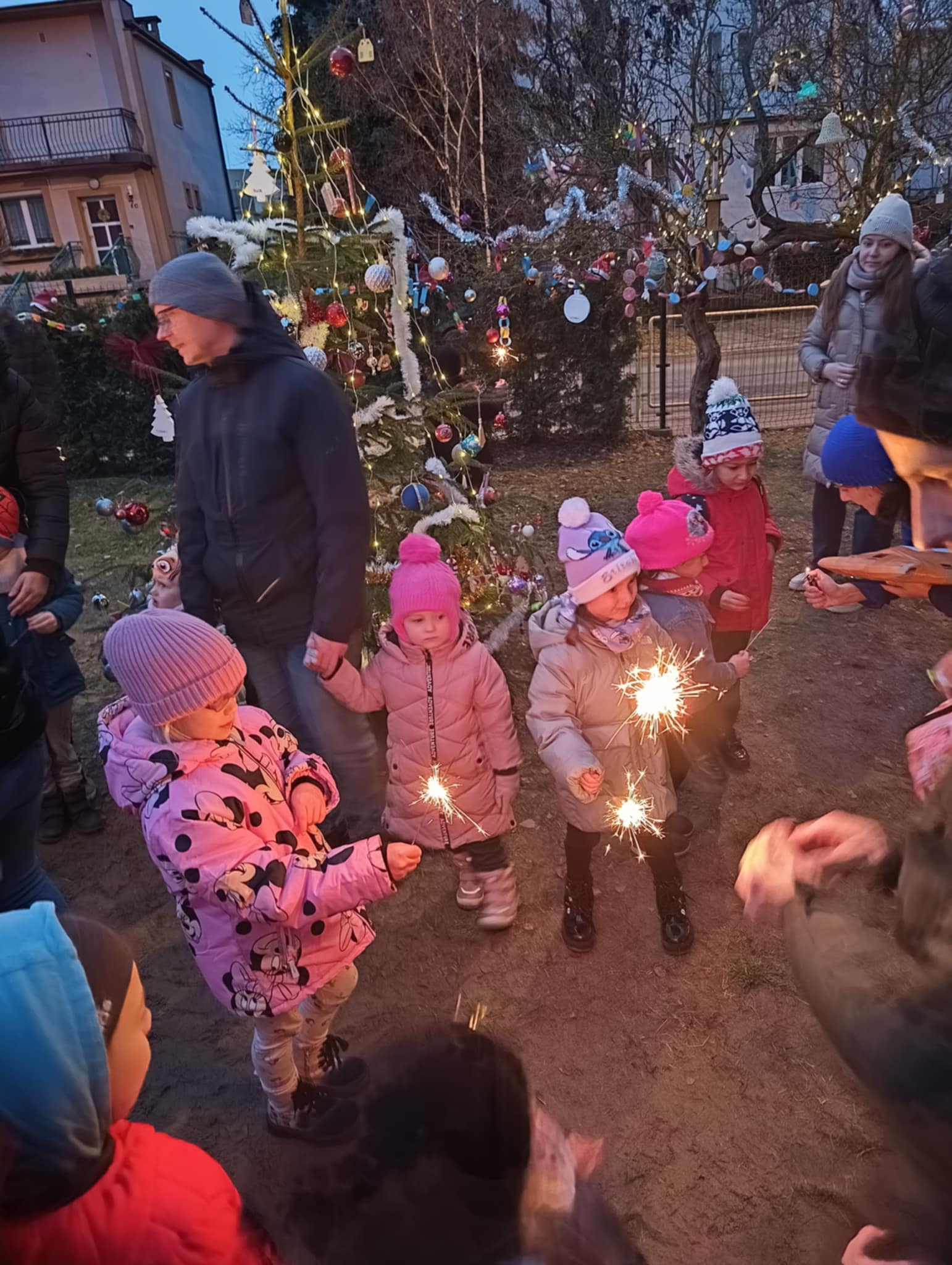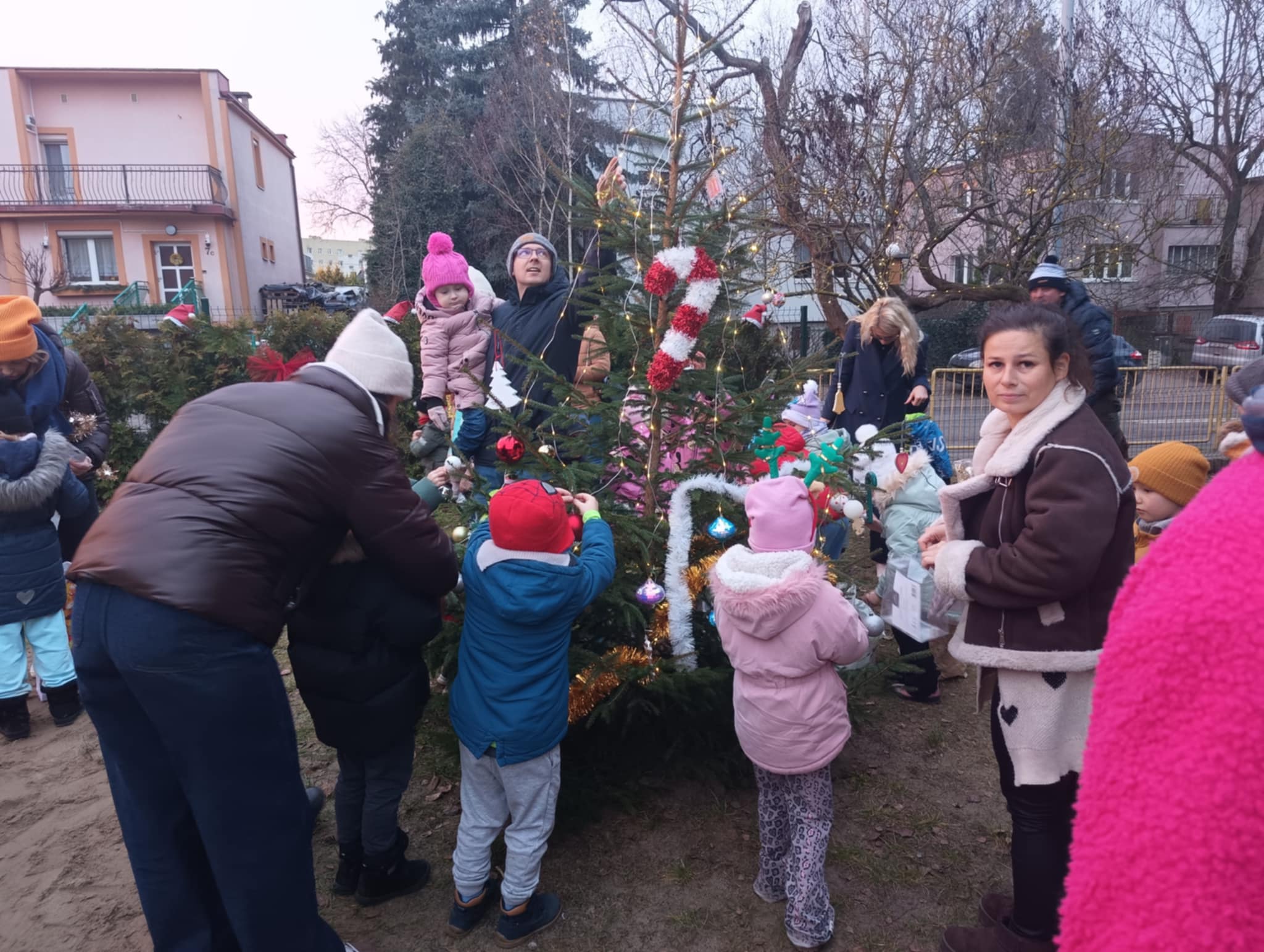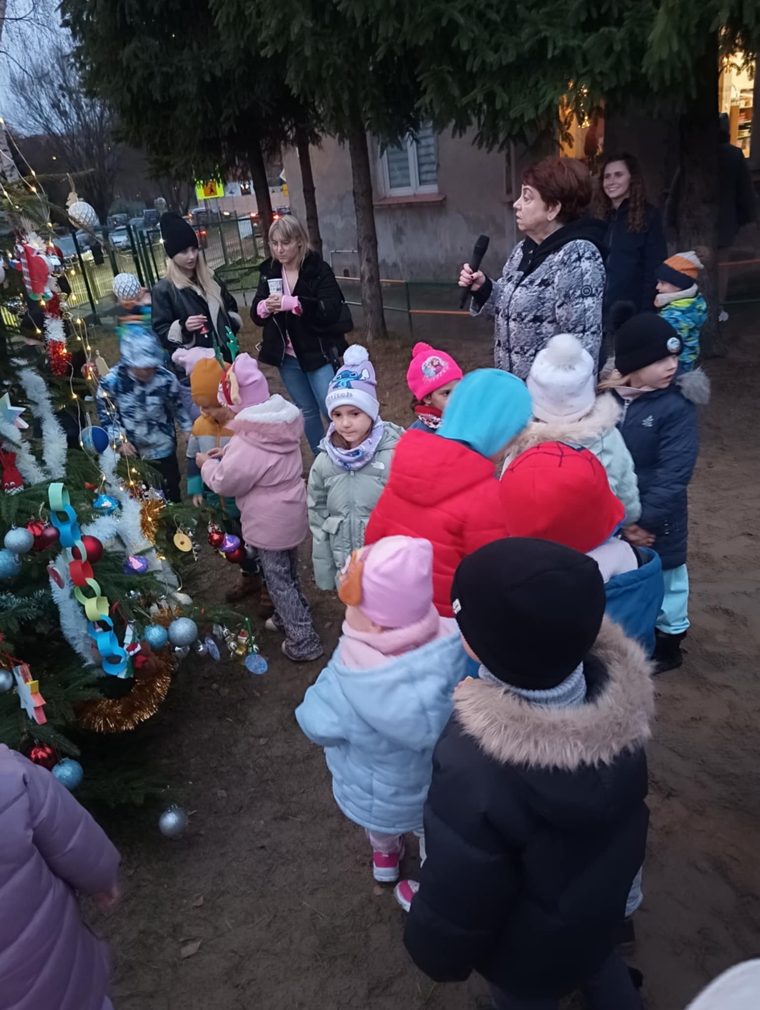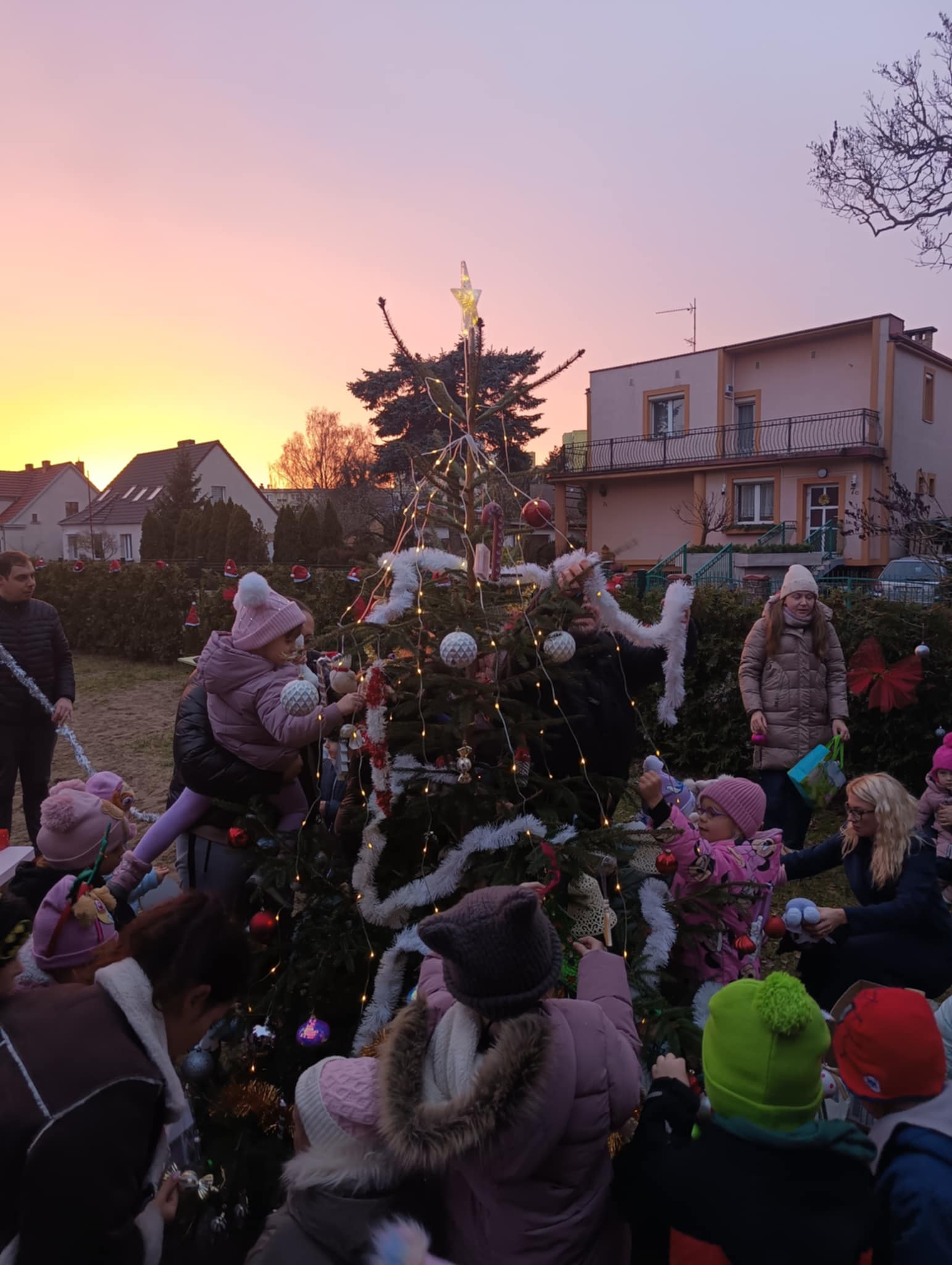 Na przedszkolnym placu zabaw odbyło się nasze świąteczne spotkanie choinkowe. Dzieci wraz z rodzicami wspólnie ubierały choinkę, przygotowały kolorowy łańcuch papierowy, a także śpiewały świąteczne piosenki, tworząc ciepłą, zimową atmosferę.