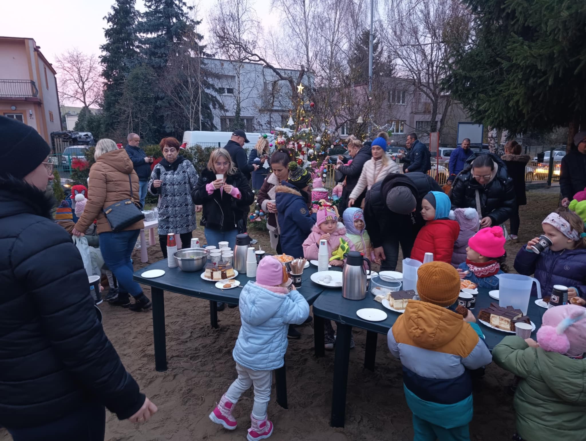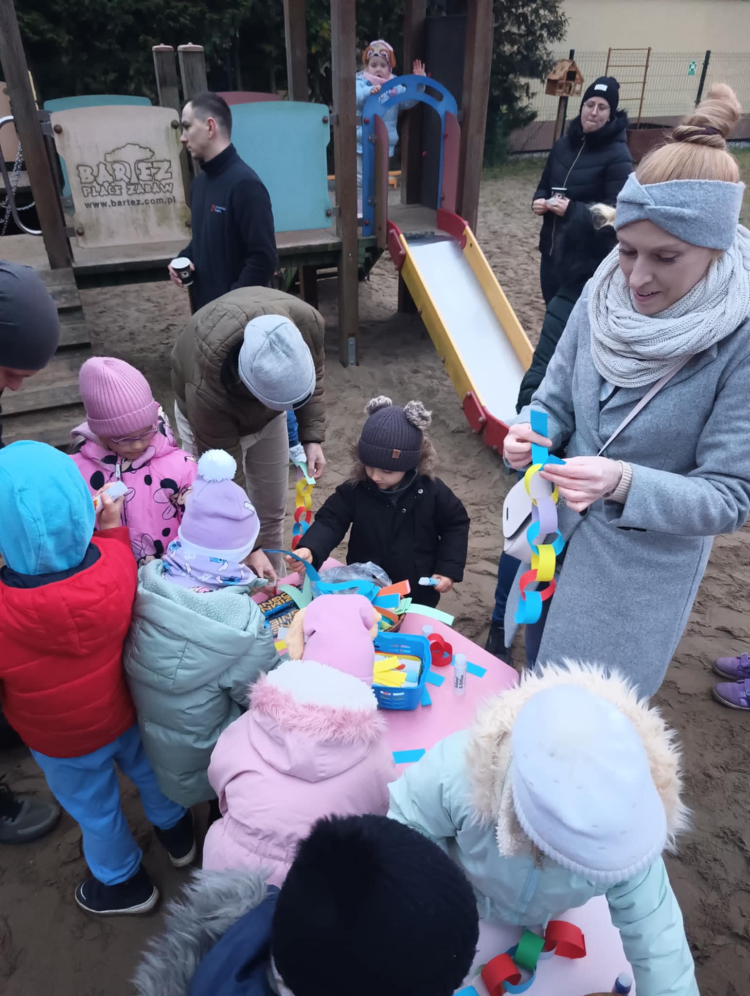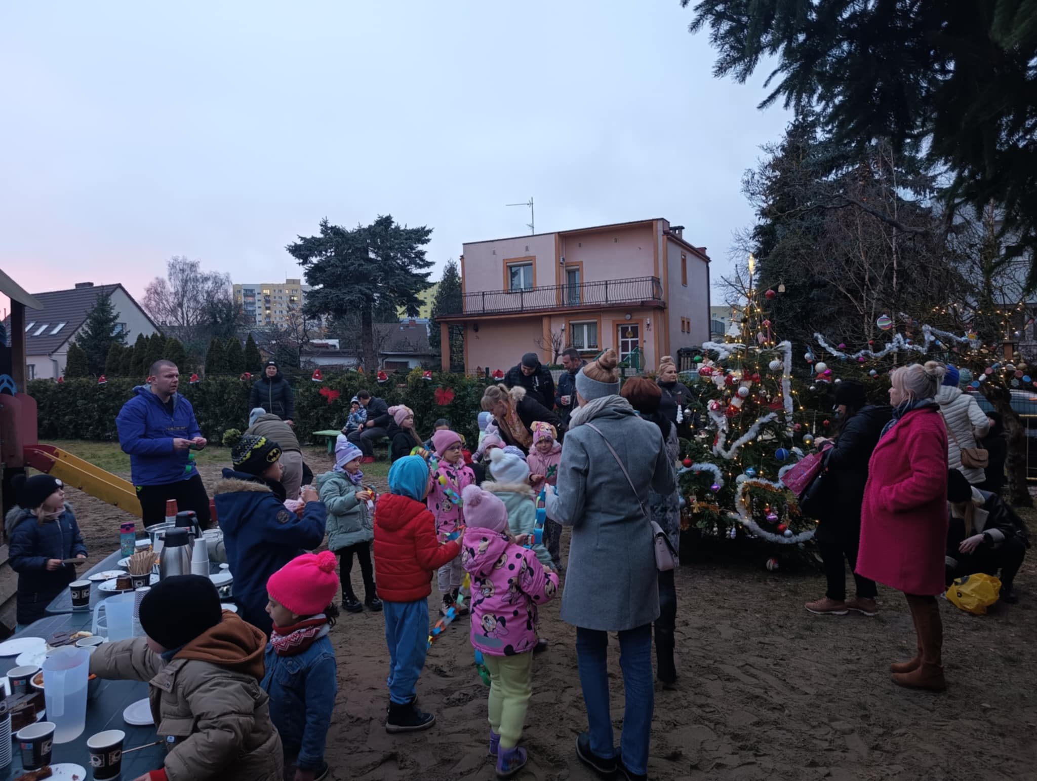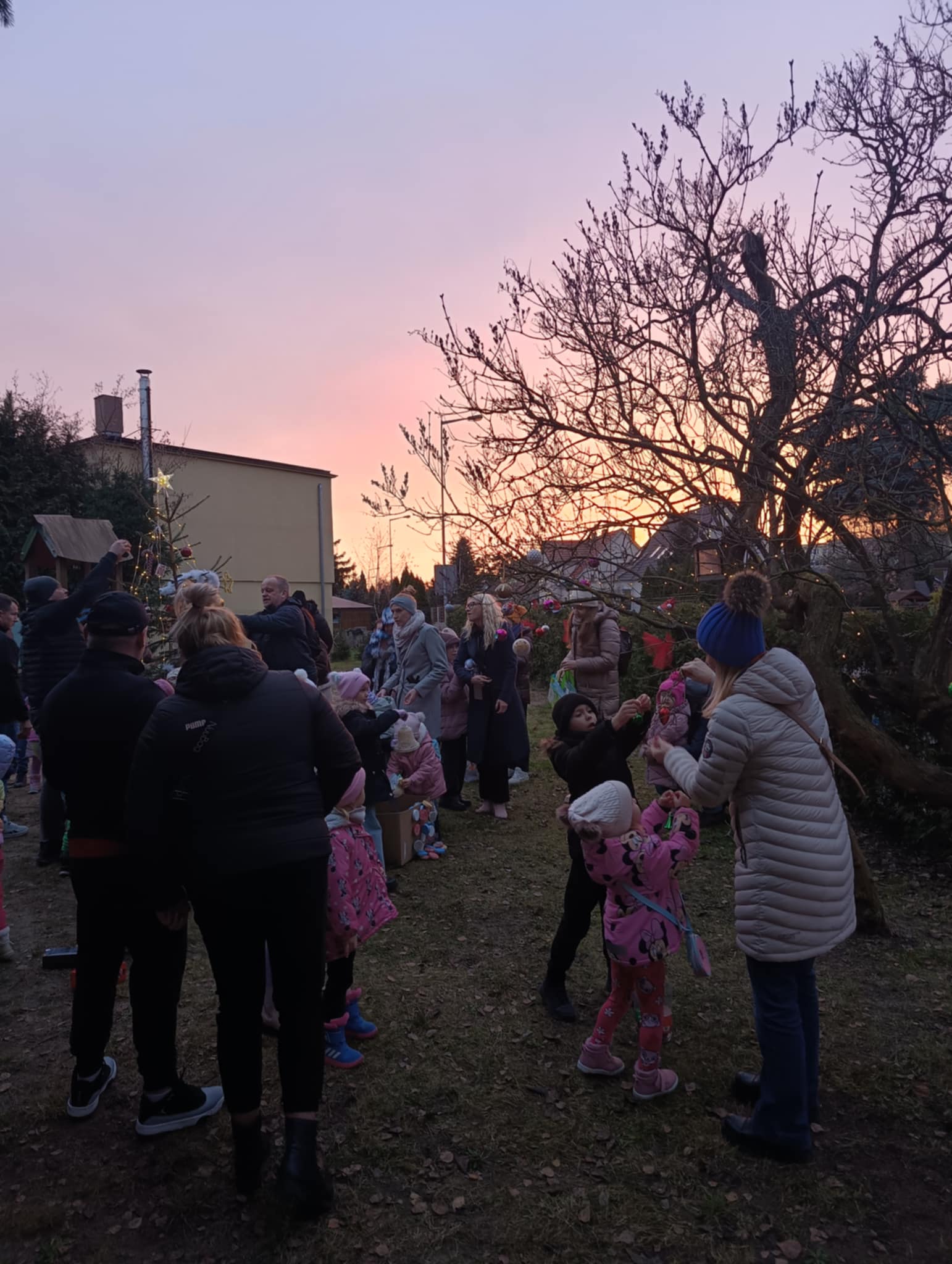 Na przedszkolnym placu zabaw odbyło się nasze świąteczne spotkanie choinkowe. Dzieci wraz z rodzicami wspólnie ubierały choinkę, przygotowały kolorowy łańcuch papierowy, a także śpiewały świąteczne piosenki, tworząc ciepłą, zimową atmosferę.