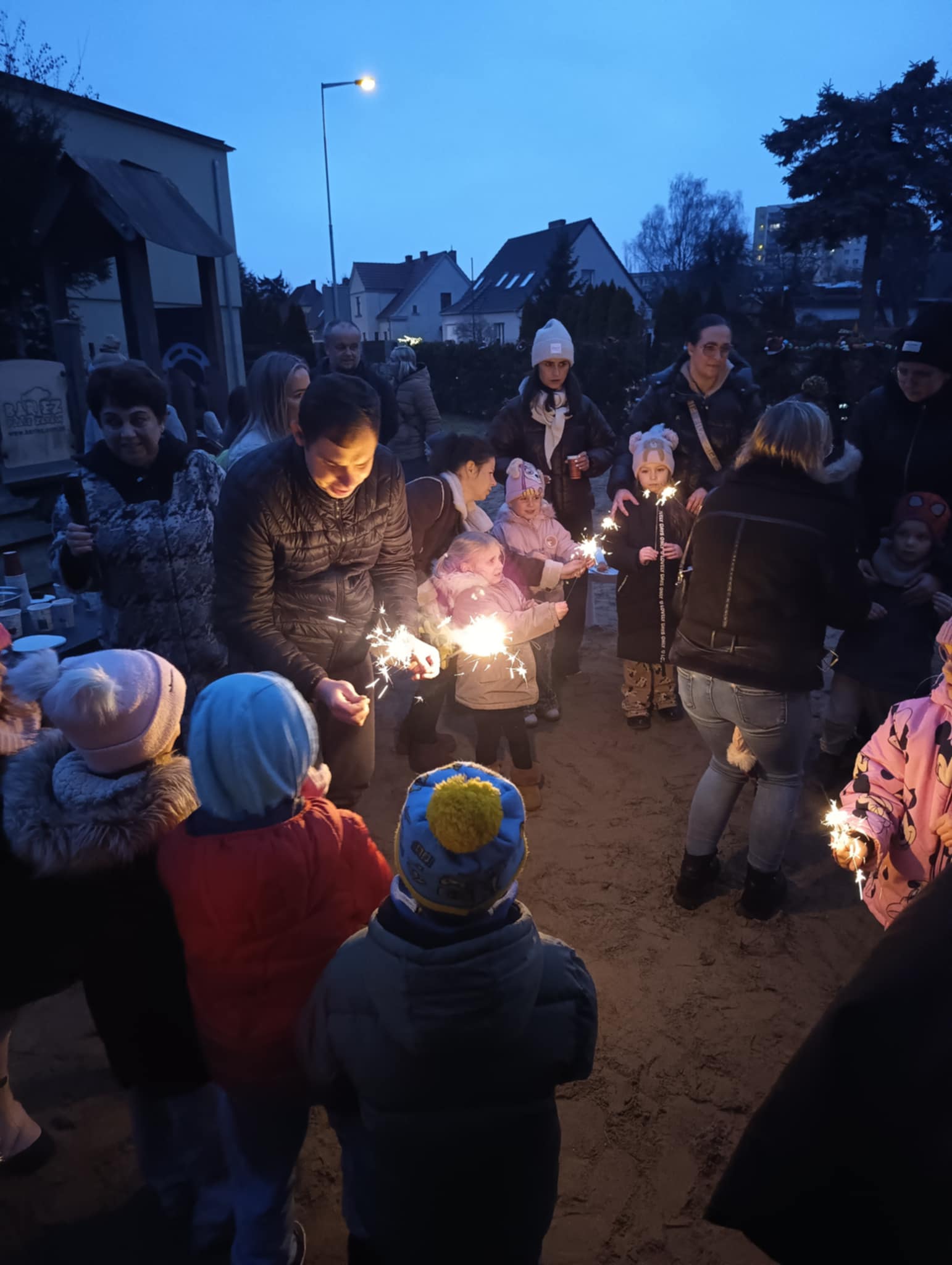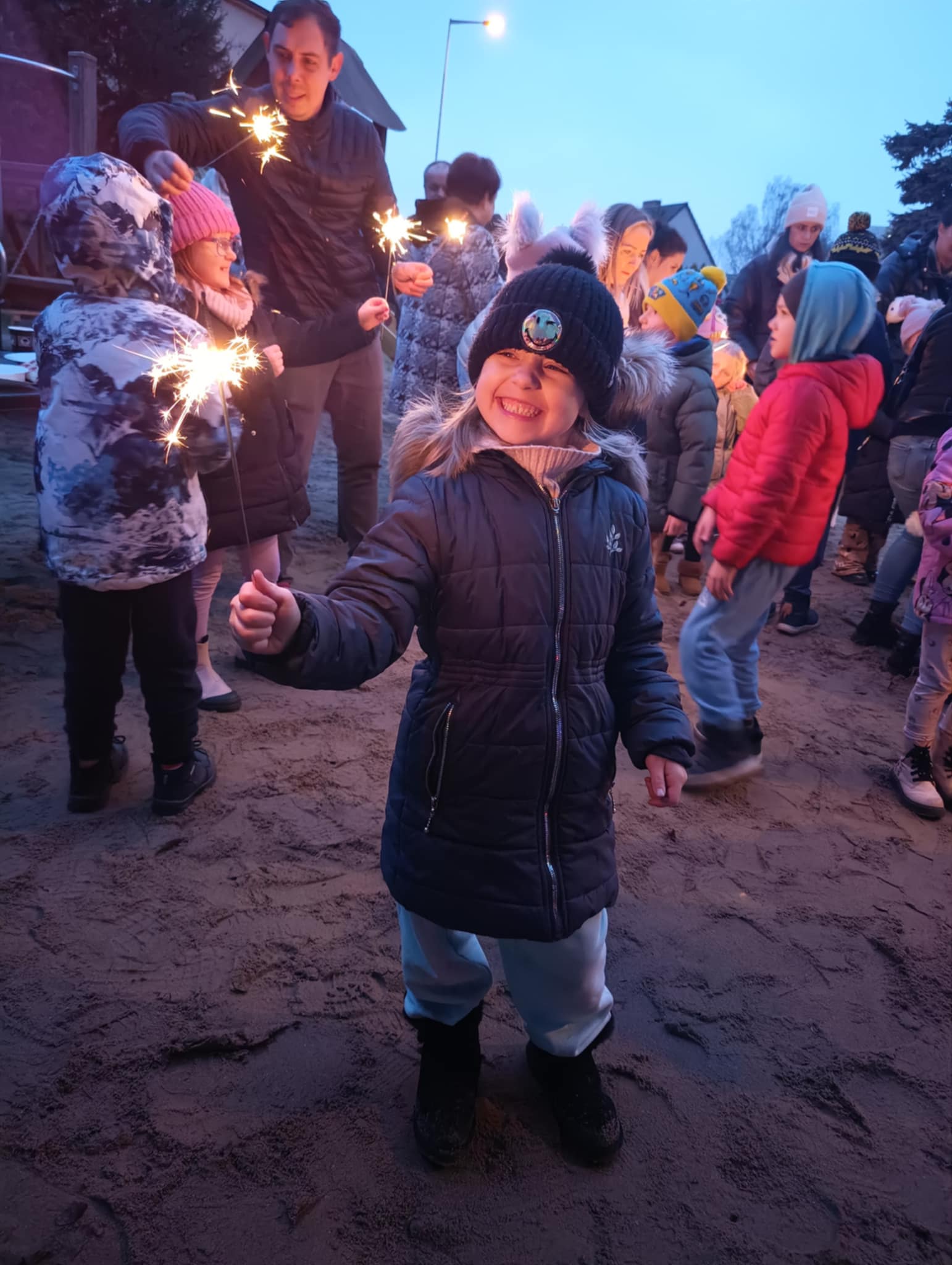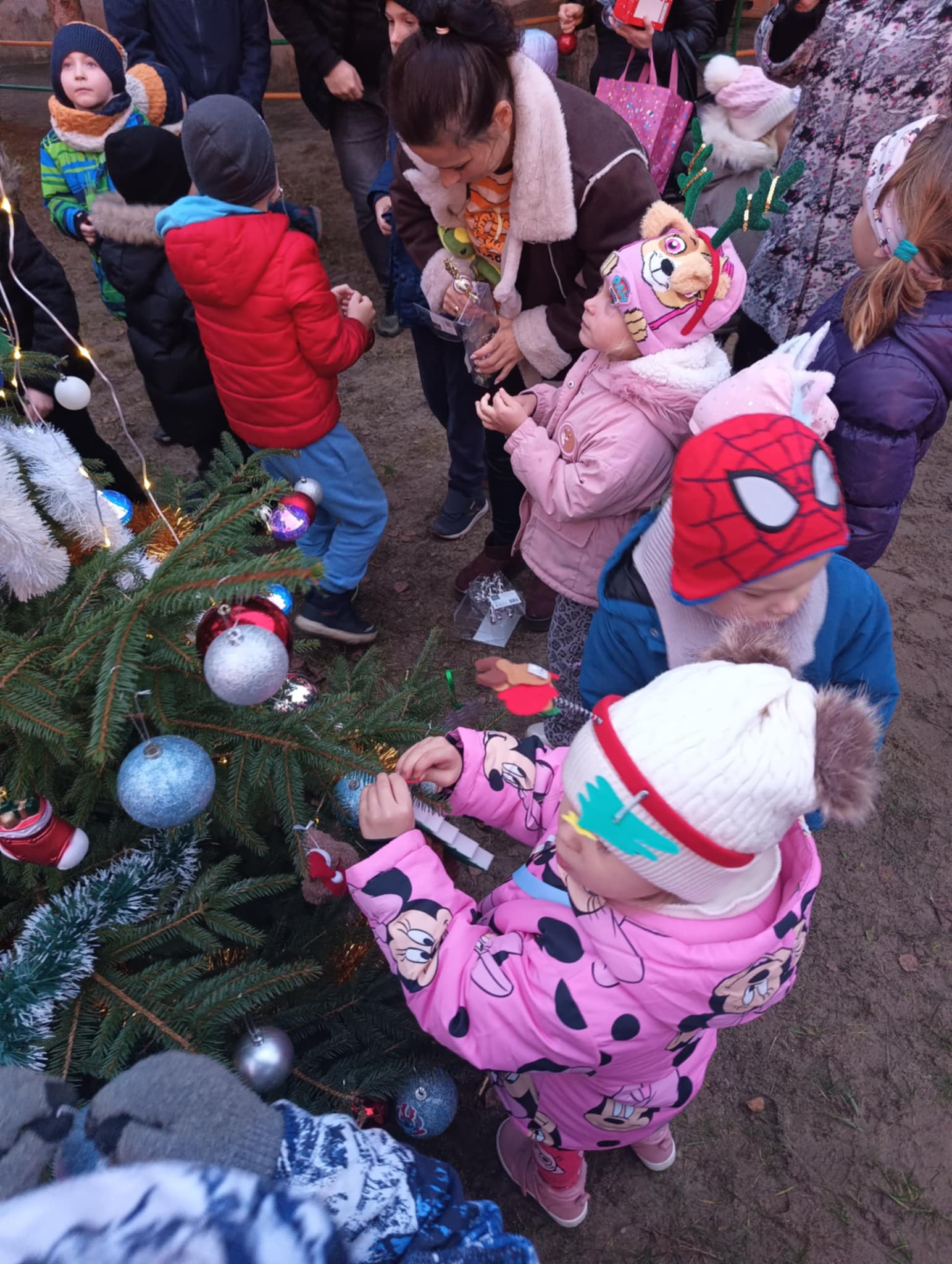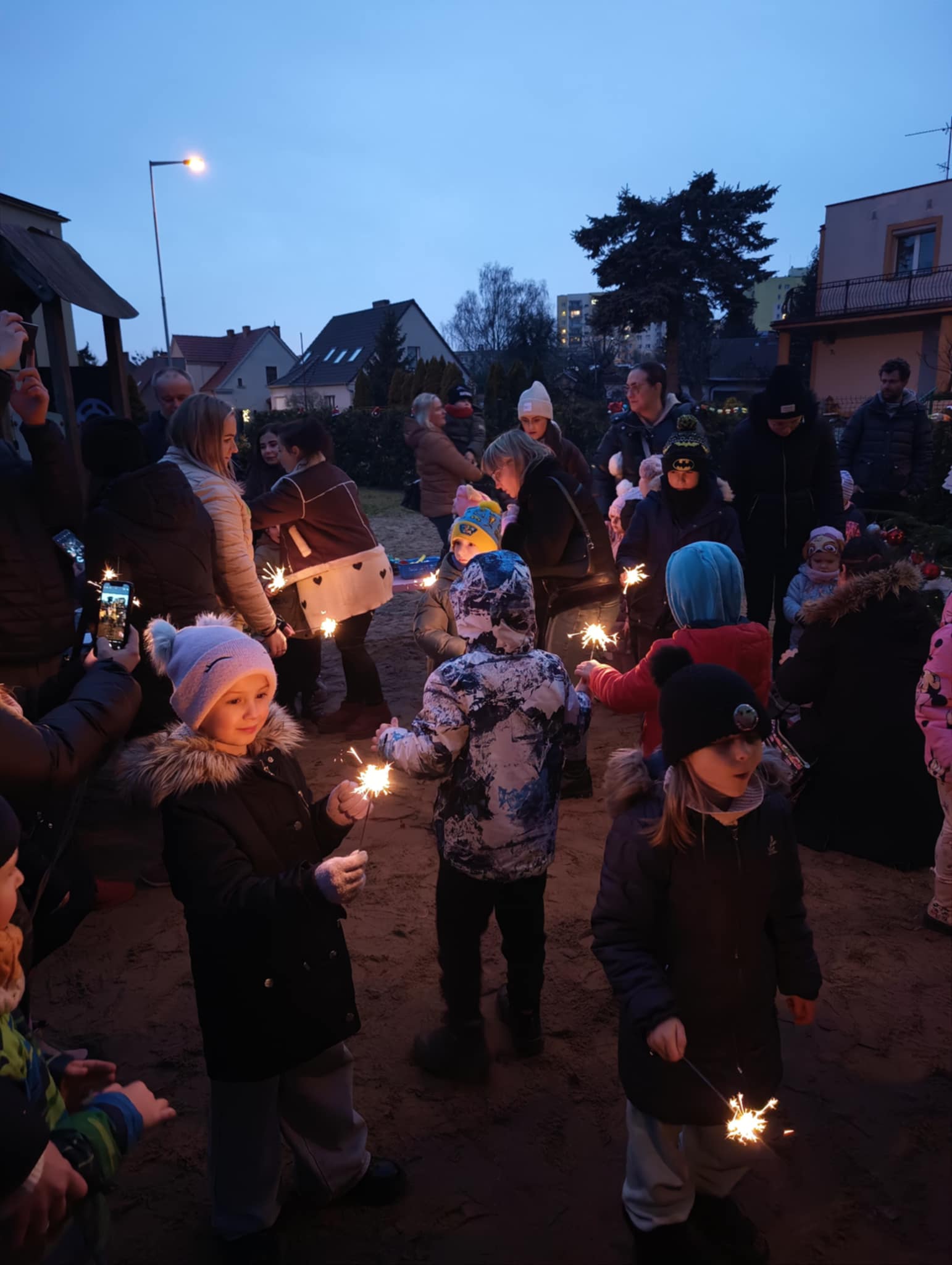 Na przedszkolnym placu zabaw odbyło się nasze świąteczne spotkanie choinkowe. Dzieci wraz z rodzicami wspólnie ubierały choinkę, przygotowały kolorowy łańcuch papierowy, a także śpiewały świąteczne piosenki, tworząc ciepłą, zimową atmosferę.